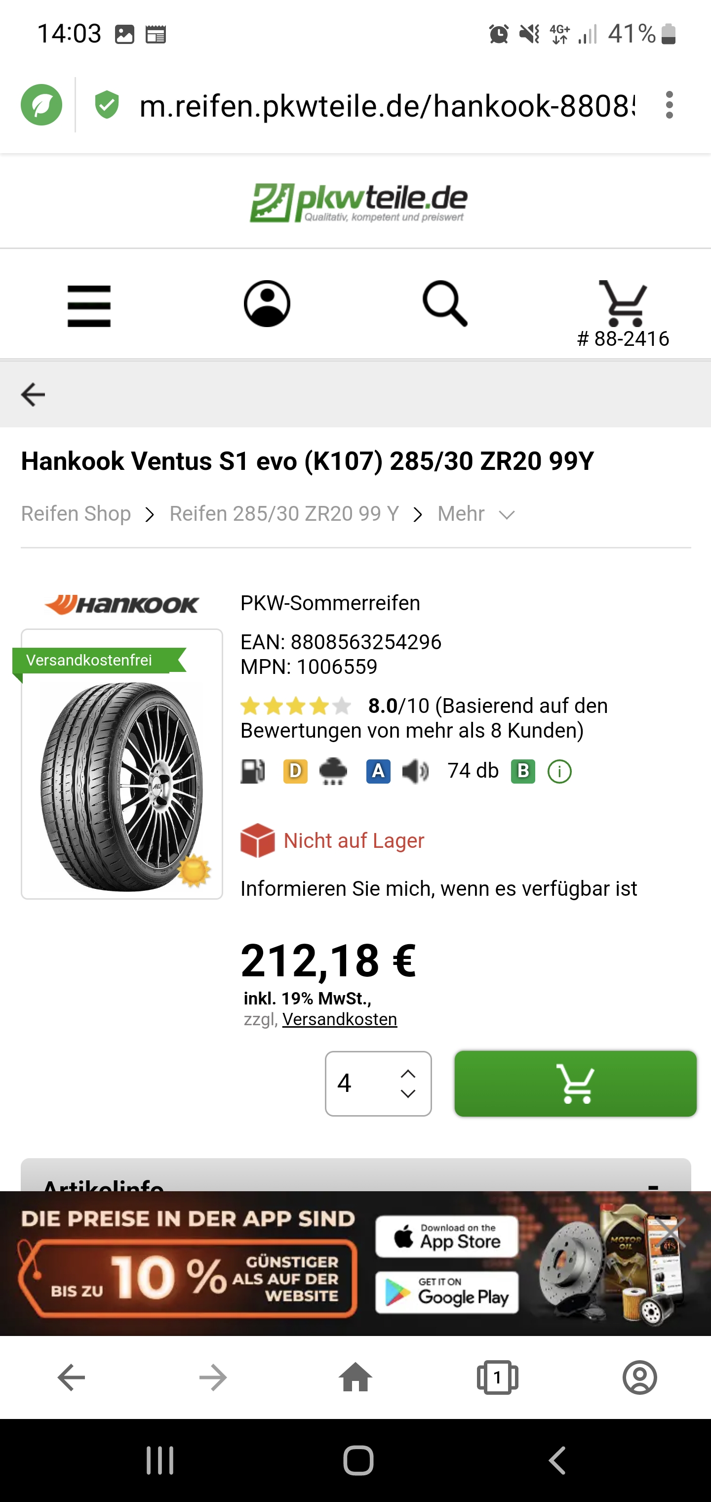 Re: Suche 1x Hankook Ventus S1 Evo K107 - 285/30 R20 99Y