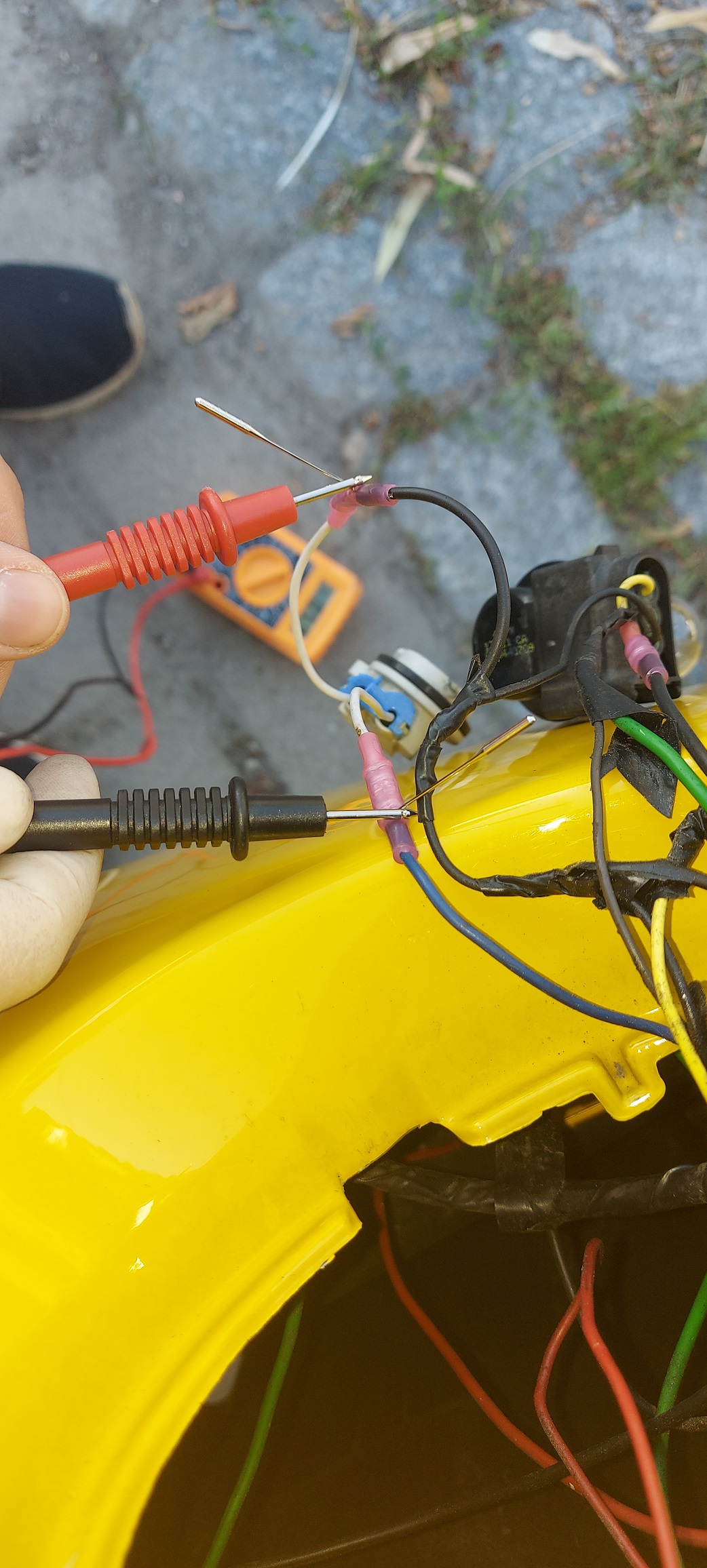 Du hast doch bestimmt irgendwo ein Stück Kabel herumliegen. Befestige ein Ende am äußeren Lamoensockel wo Masse anliegen soll und leg das andere Kabelende auf die Minusklemme der Batterie, oder irgendwo auf einen träger wo Masse drauf ist.