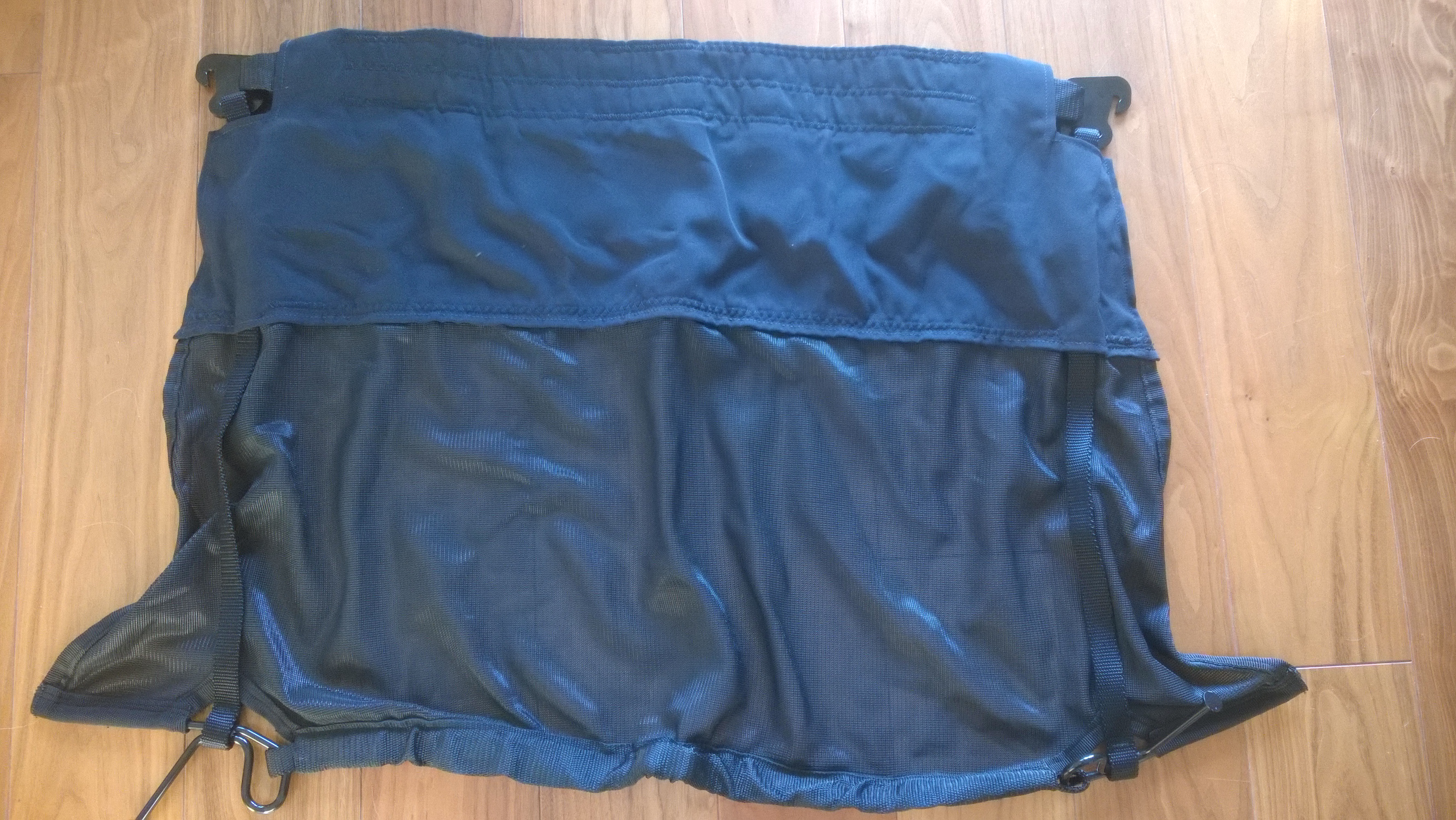 Das Netz wird hinten an 2 Haken rechts und links eingehängt..............................gewaschen oder ungewaschen!