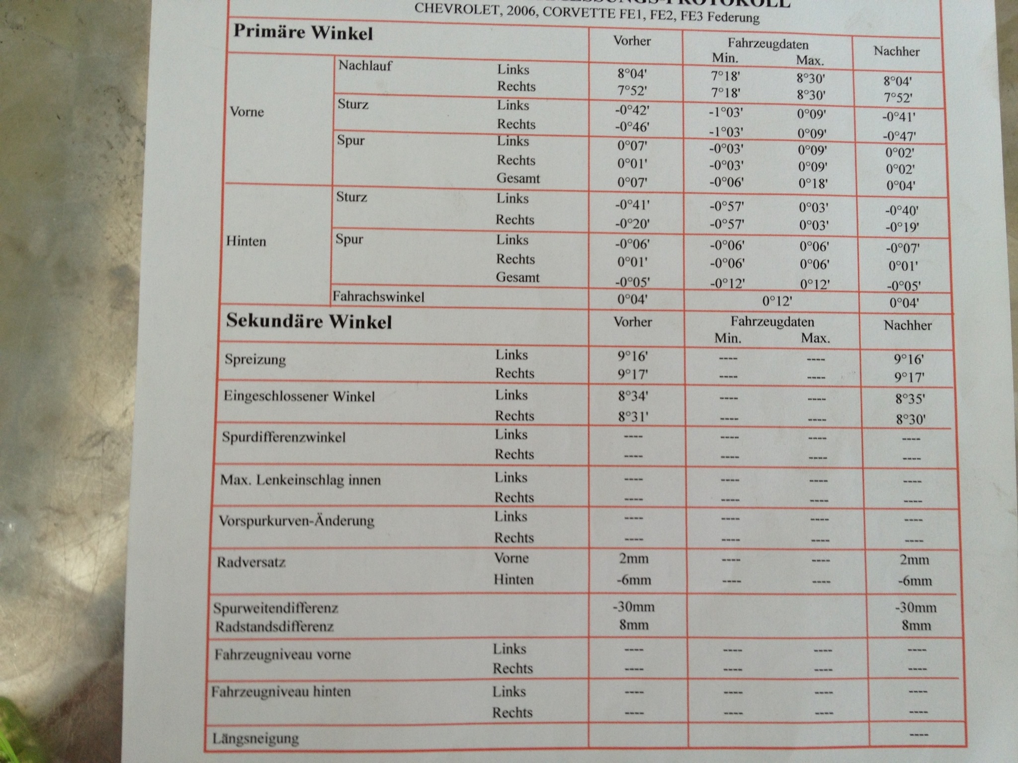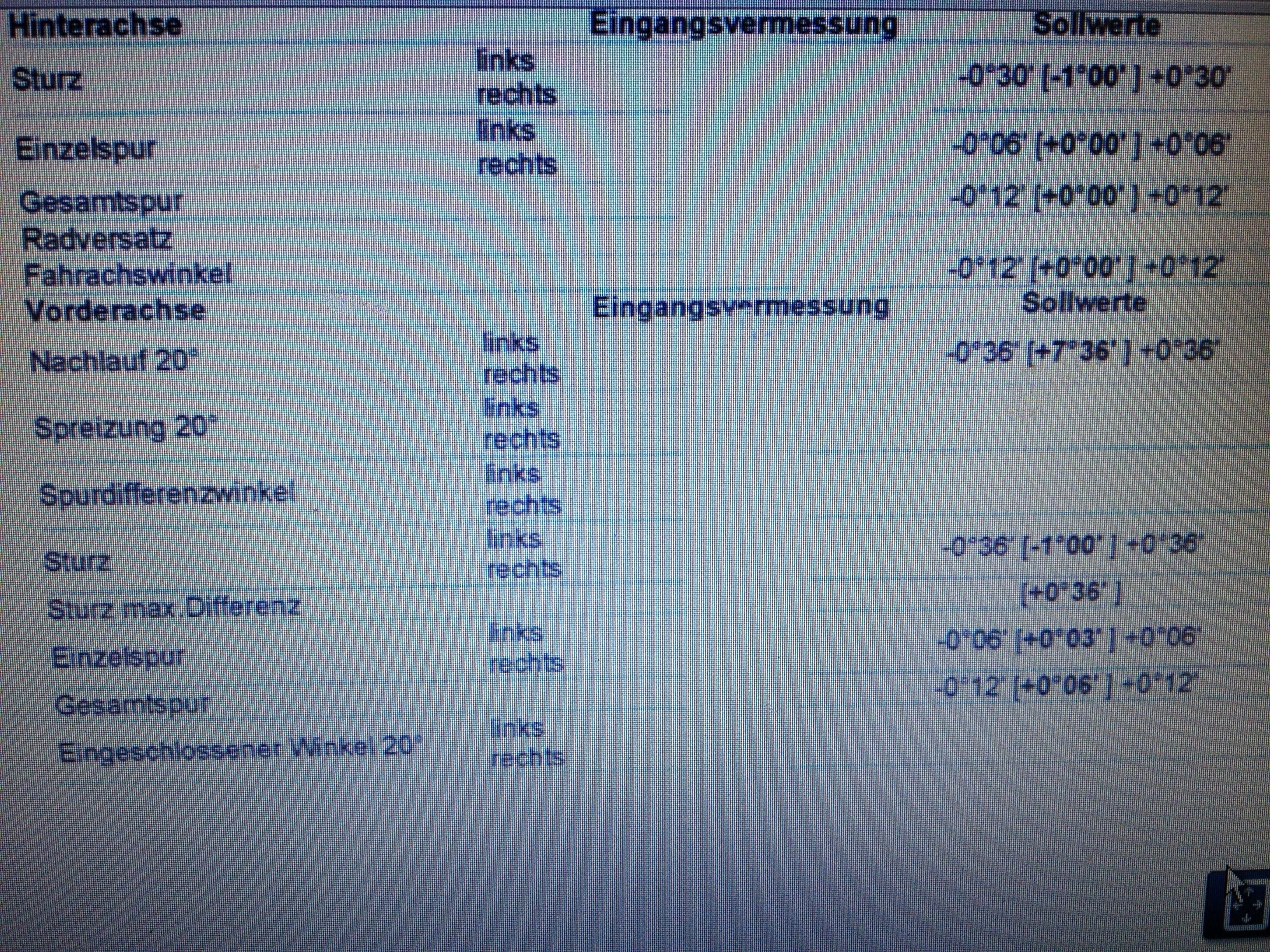 Hinten links hast du z. Z. sogar Nachspur = negative Vorspur. Gewünscht ist aber leichte Vorspur.