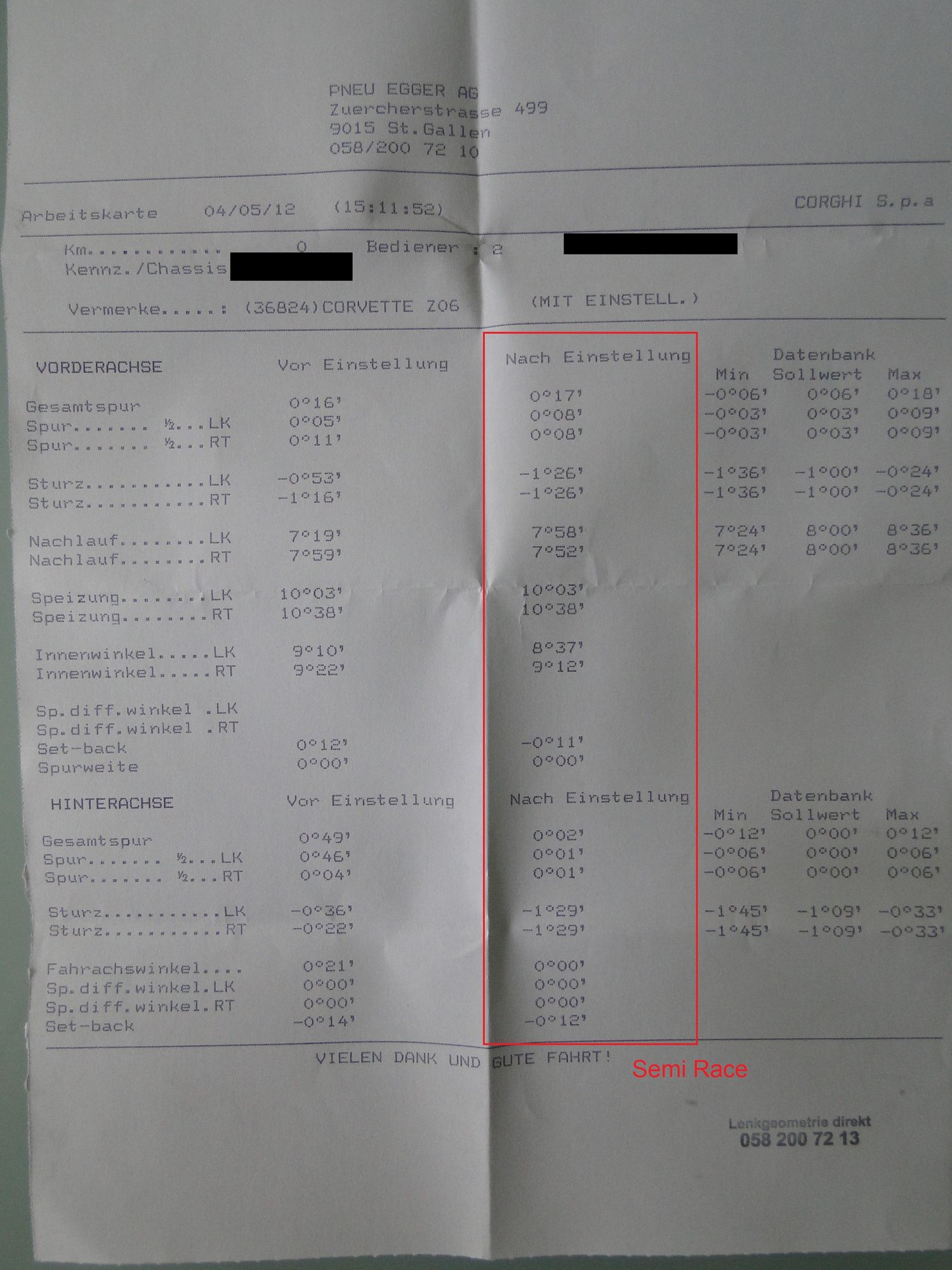 In einer Woche wird der Auspuff umgeschweisst und das Fahrwerk eingestellt. Hoffe die Werte im angehängten Bild sind ok, die habe ich aus dem blauen Forum aus einer ellenlangen Diskussion. Jetzt gerade fahre ich die Vorderräder eckig und die Vette schiebt über die Vorderachse in langsamen Kurven/im Kreisverkehr und ist sehr anfällig für Spurrillen.