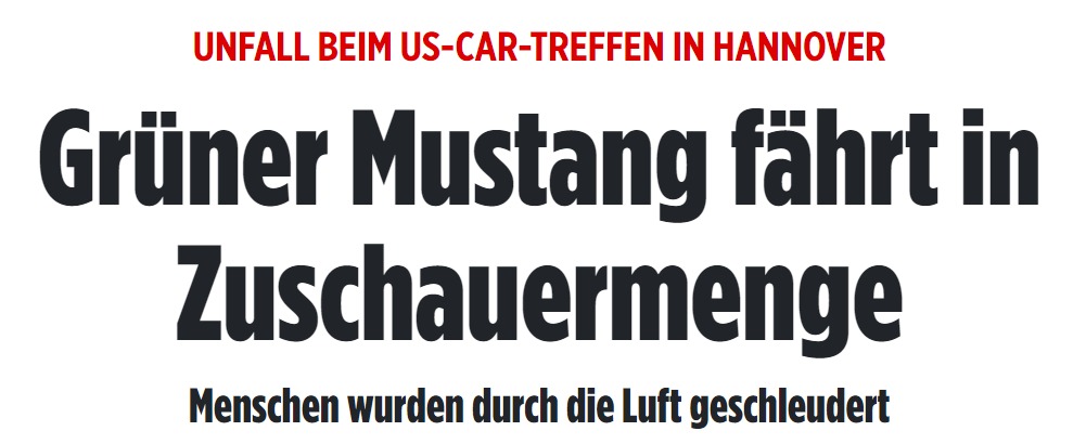 Meine Freundin Beate und ich waren dort ! Um 100m von diese böse schlimme Unglück. Motor heult auf wie verückt Reifen laut quitschen. Wir hören nur und sehen nichts weil zu viele Leute. Eine Moment später Leute schreien und fliegen über die Köpfe der andere. Sehr böse verletzte Leute und viel Blut überall auf Auto und Straße. Sehr sehr Böse alles. Gut das Leute sofort versuchen irgen was zu helfen. Schlimm andere sehen nur zu und machen Video mit Handy. Polizei und Ambulanz kommt sehr schnell. So oder so eine schlechte Party gewesen. Viele alte Bling-Bling Schrott US-Car und ein paar immer viel Burnout an den Ampel überall in der Stadt. Nie wieder gehen wir zu so eine Treffen !