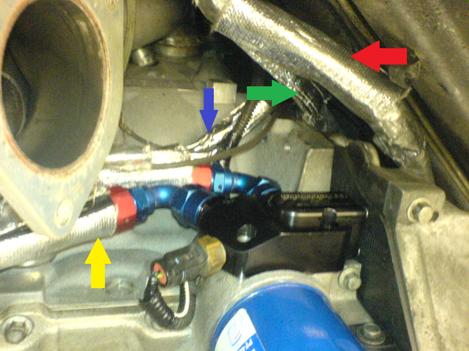 Gelber Pfeil = Ölleitungen (Hitzeschutz Klettverschluss)