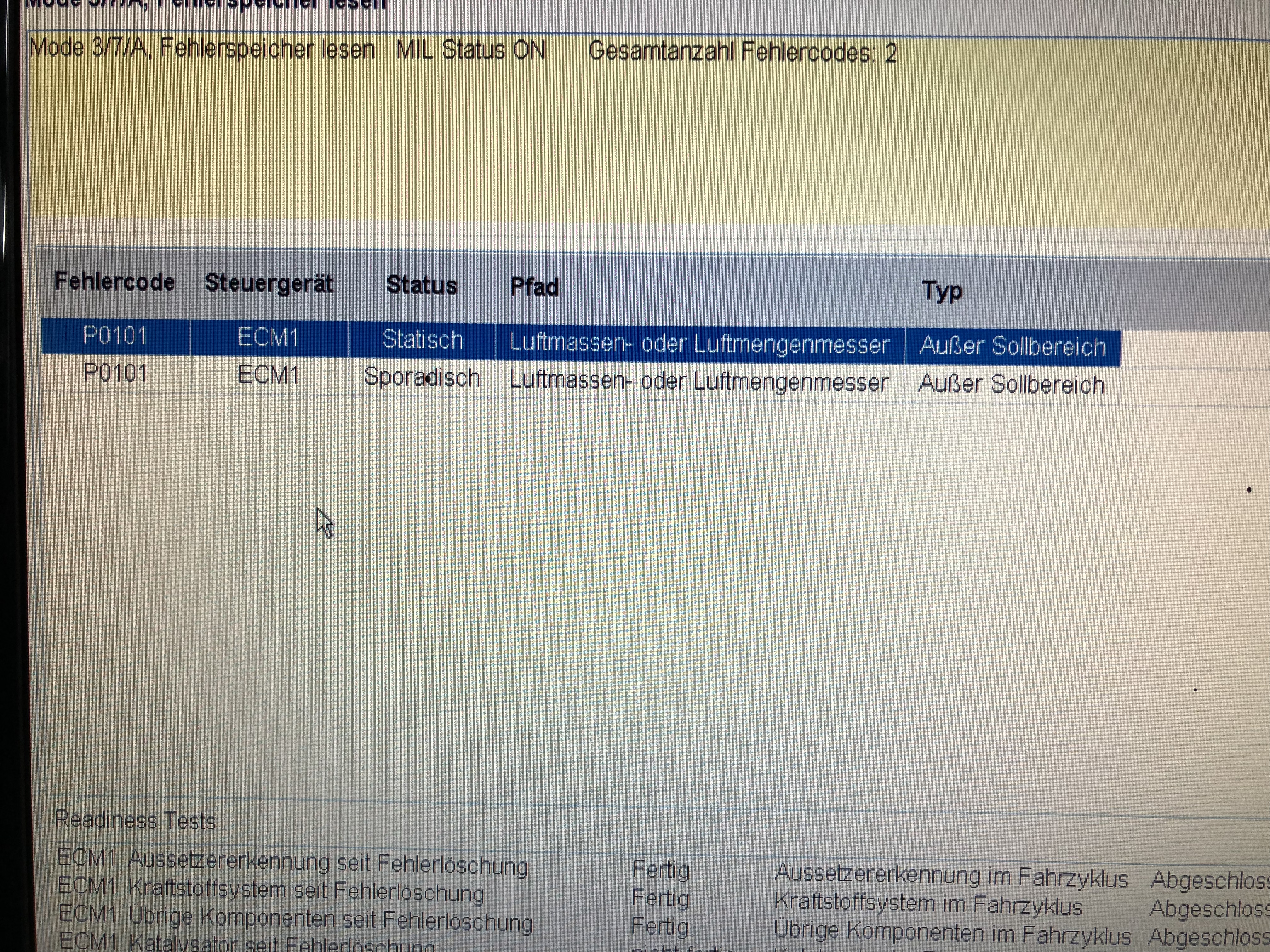Nachdem ich einen neuen LMM (Luftmassenmesser) verbaut habe, tauchte das Problem wieder auf mit dem gleichen Fehlerspeichereintrag.