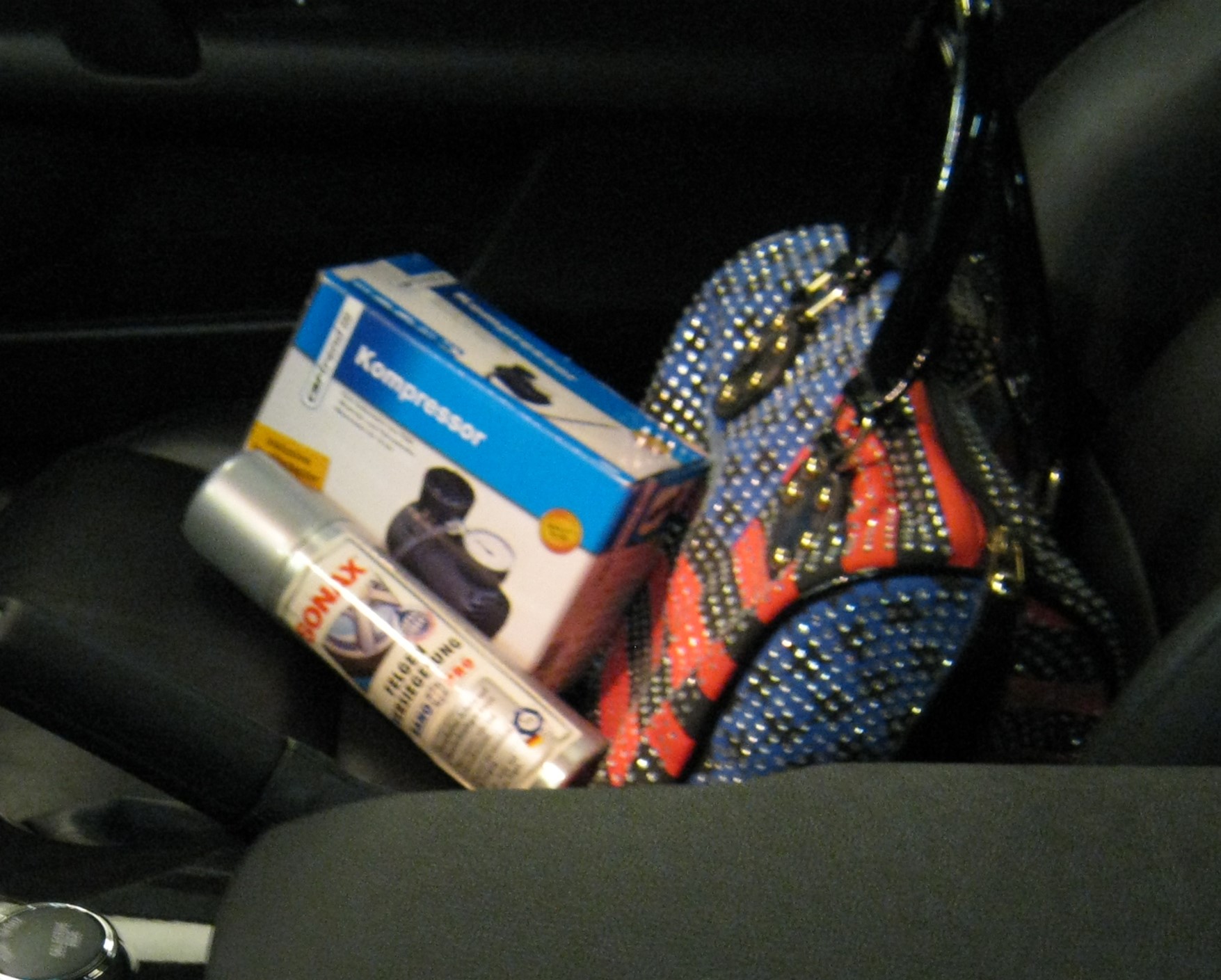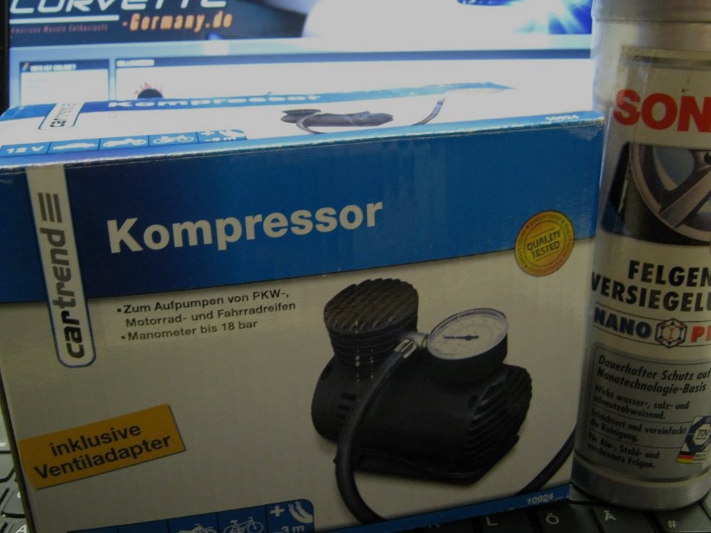 An der Kasse habe ich von Chef noch eine kleine süße Luftmaschine als präsent bekommen weil ich jetzt nicht mehr Runflat Reifen habe. Und eine Dose mit Spray dann soll das Bremsenstaub besser abgehen. Muss in Ruhe sehen wie beide Funktioniert.
