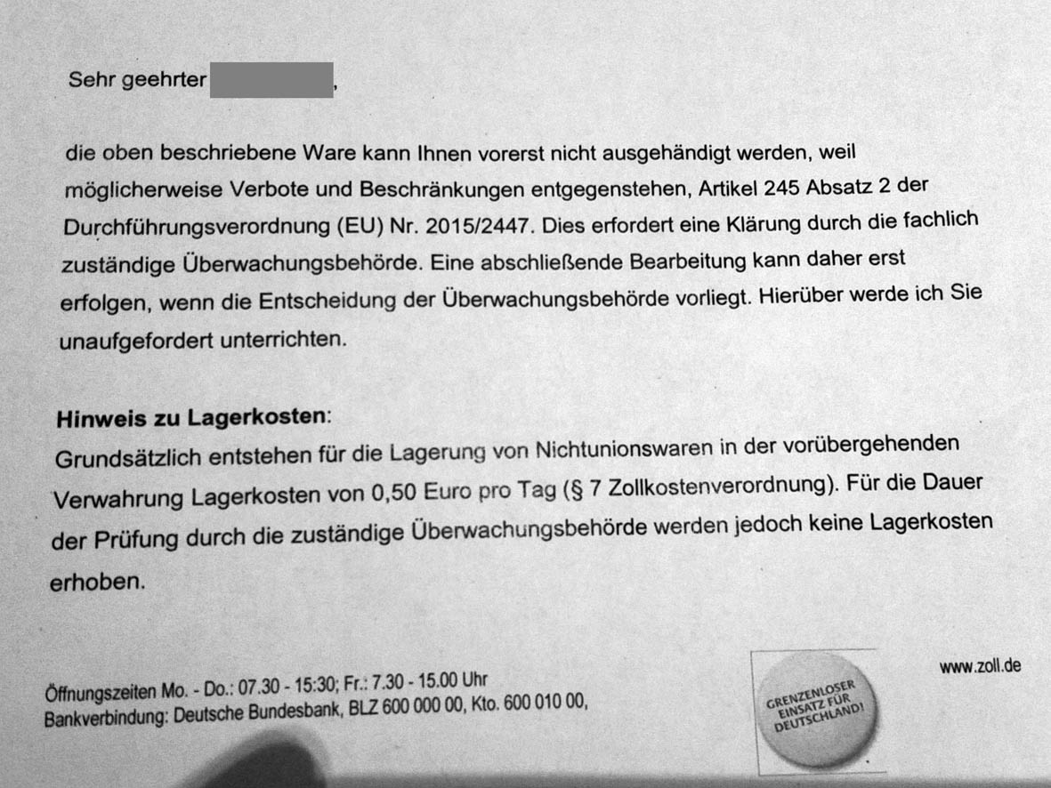 Fazit: Als Auto, im Auto oder über ein EU-Land darf es nach Deutschland - aber als Paket nicht! [smilie=dash2.gif]